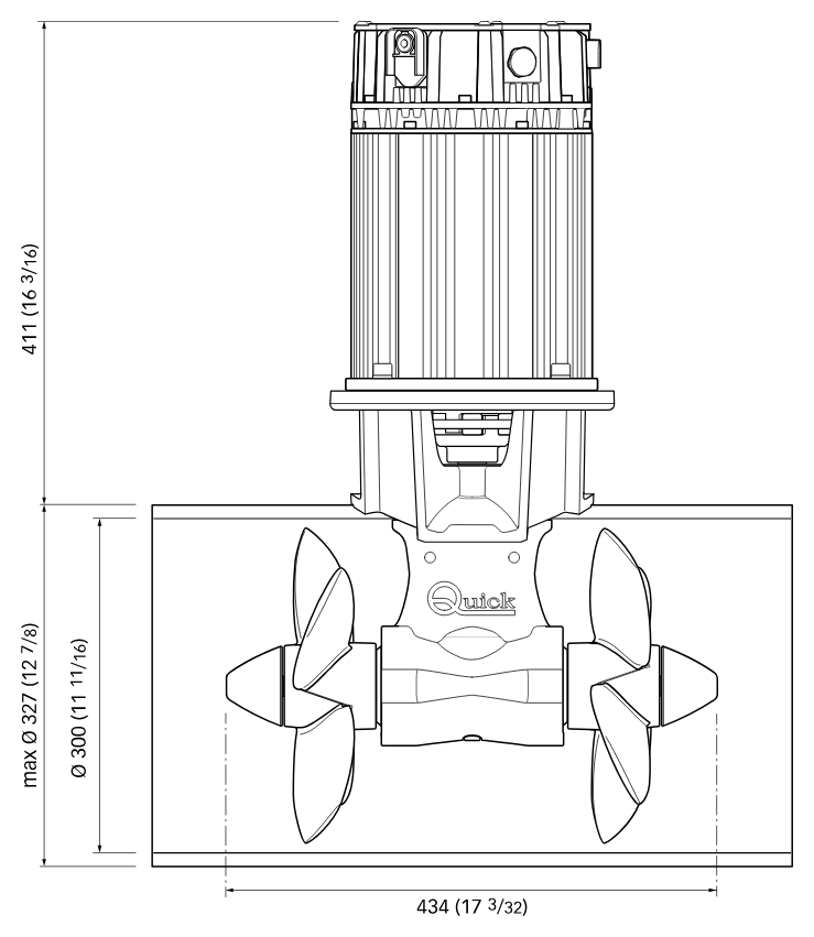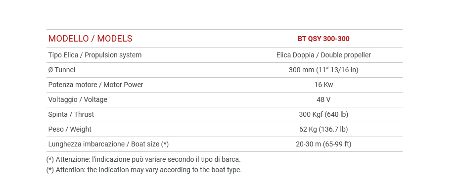 Twin propeller thruster made of solid composite material. Available models: – BTQ 300-250 (250 Kgf – 10000W – 24V – Ø 300mm) – BTQ 300-270 (270 Kgf – 12000W – 24V – Ø 300mm) – BTQ 300-300 (300 Kgf – 15000W – 48V – Ø 300mm) – BTQ 300-300 Nib. (300 Kgf – 15000W – 48V – Ø 300mm) – NIBRAL Propellers