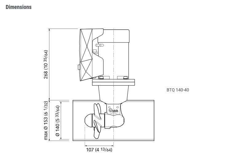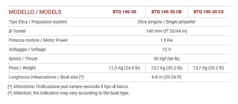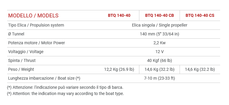 This SET includes BTQ 140 thruster with 1 propeller, tunnel, joystick control with cable, fuse with bracket, and battery switch. Available sets are: – BTQ 140-30 SET (30 Kgf – 1500W – 12V – Ø 125mm) – BTQ 140-40 SET (40 Kgf – 2200W – 12V – Ø 125mm)