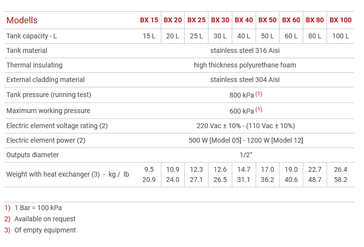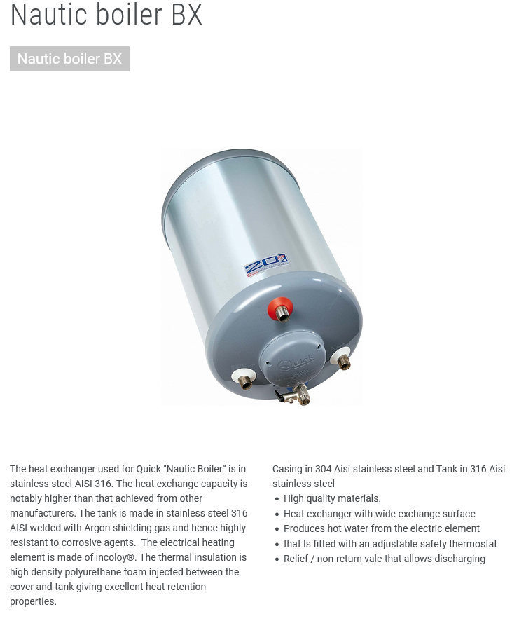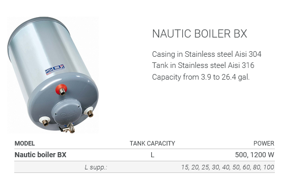 NAUTICAL BOILERS “BX” ROUND – housing made of stainless steel AISI 301, tank AISI 316 Inox. Available in sizes of 15L and 50L and have the possibility of heating water via a heater (220 Vac) and via a motor.