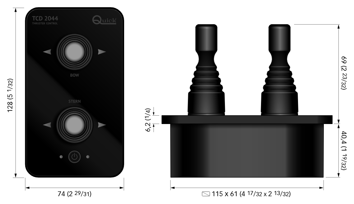 Quick TCD series commands are designed to control stern and bow thrusters produced by Quick. Double Joystick TCD 2044 command serves to control two BTQ thrusters, bow and stern, through a command equipped with two single joystick controls.